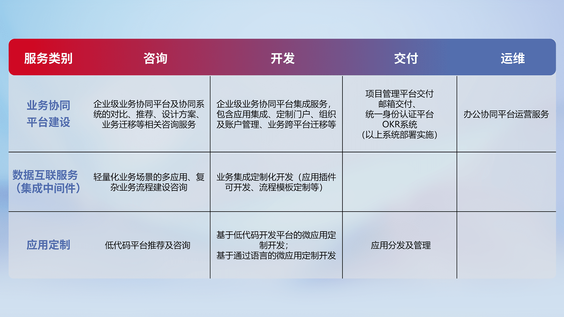 针对钉钉、、企微、、IDaas等平台级产品提供产品的规划、、方案、、、交付、、定制化开发等服务,,,实现如统一协同办公、、智能客户服务、、、混合会议管理、、智能数据查询、、、、等业务场景,,实现数字化转型。。。。