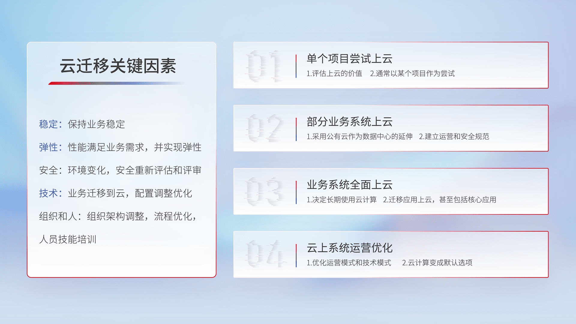 结合实际业务,,,,从规划设计、、、云平台选型、、云原生改造、、数据迁移、、集成交付,,,,迁移全过程为客户识别最佳上云路径,,,做好风险识别管理,,,设计网络架构、、、、身份权限、、、、安全审计合规、、、操作审计、、日志审计、、、监控告警策略、、多站点容灾设计等,,对云上基础设施进行整体规划,,提升IT治理水平,,以满足弹性、、、高可用、、高性能的需求。。