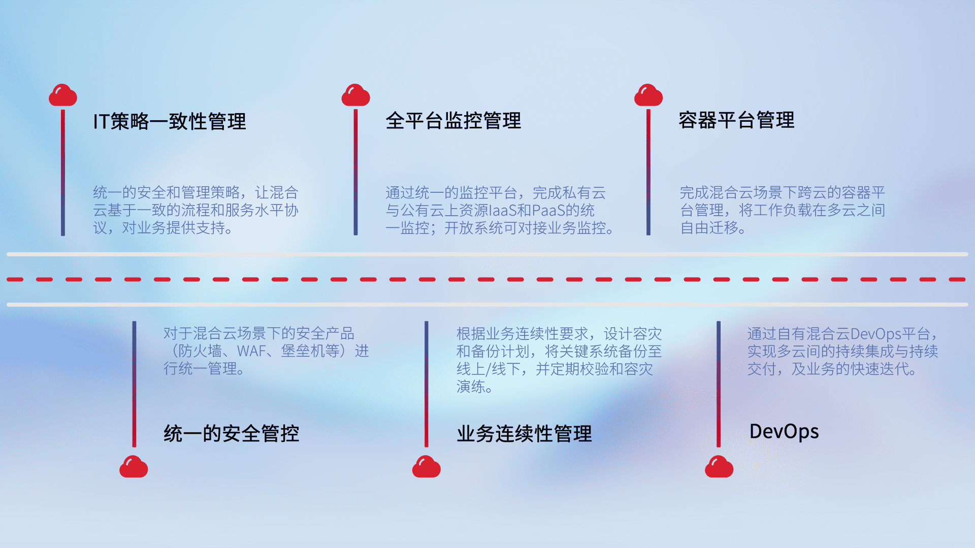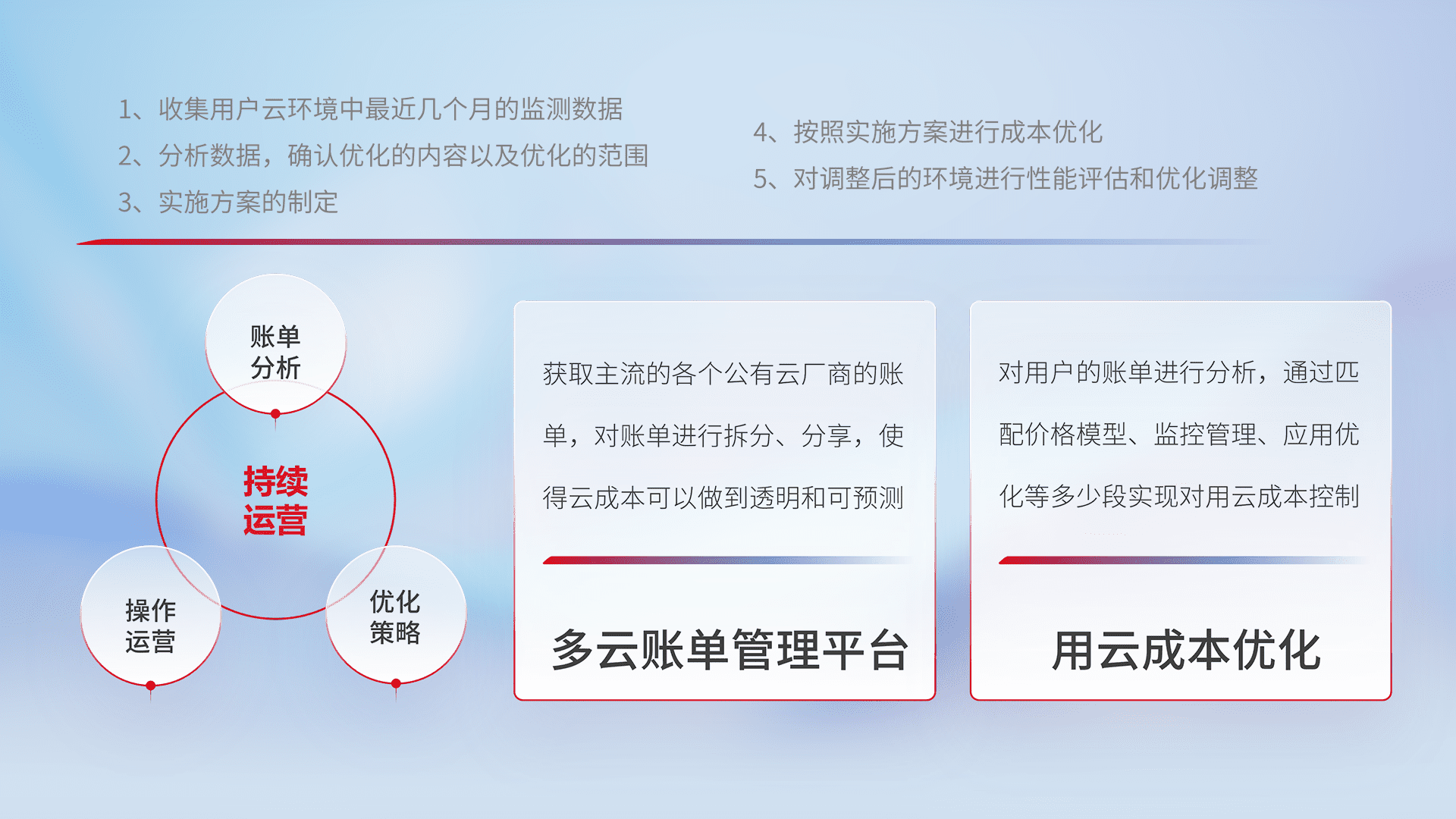 通过多云纳管,,以统一的资源数据模型把客户的云资源进行抽象和封装,,,,进而实现对多云资源的统一操作,,,保障云资源管理的可靠性、、、、稳定性与可用性。。。。量身定制化运维内容,,,,配置、、开发运维、、、补丁管理、、、备份、、、、监控、、、认证和访问管理、、、审计和日常巡检等,,,,保障在用云过程中的可靠度,,,稳定度以及高可用率。。。