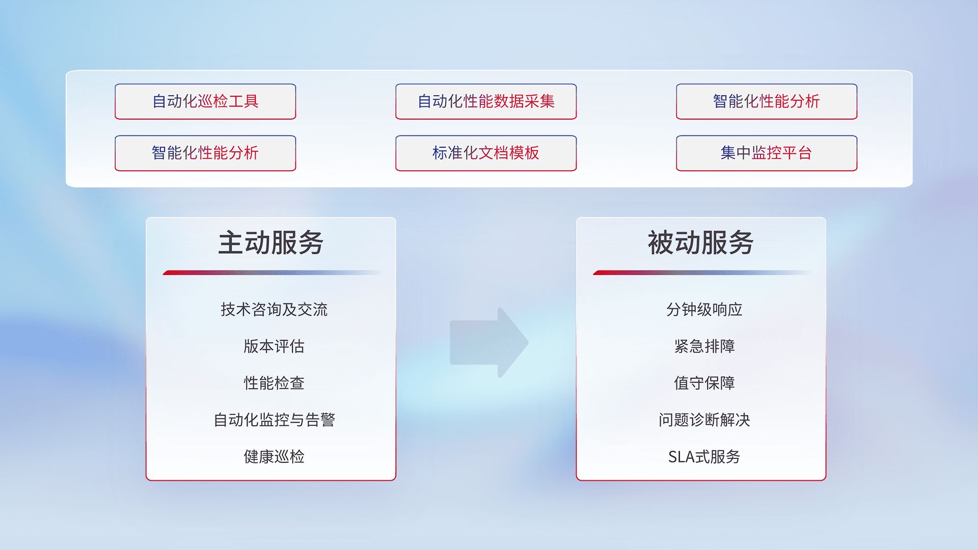 智能化工具和标准化文档,,,保障服务质量,,,提供主动服务(包含技术咨询、、、、版本评估、、性能检查、、、、自动化监控与告警、、、健康巡检)和被动服务包含(分钟级响应、、、、紧急排障、、值守保障、、、问题诊断解决、、、SLA服务)。。。